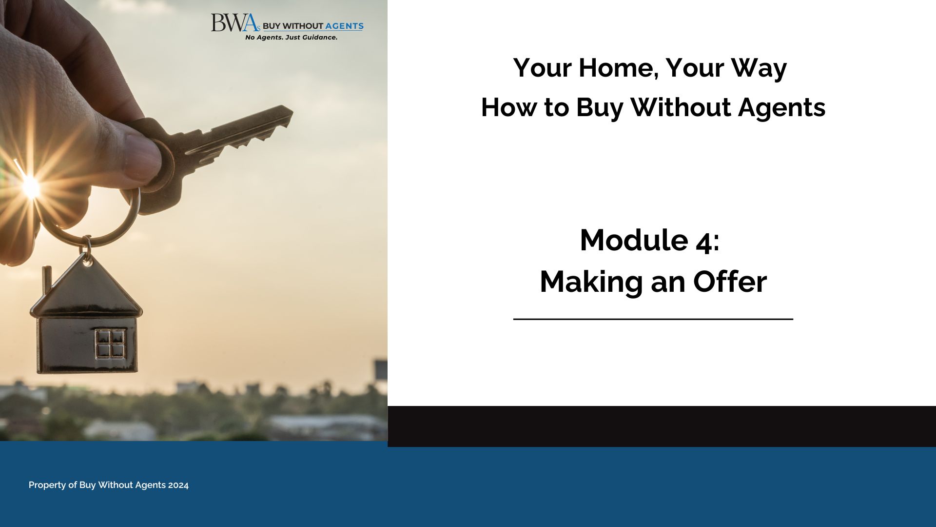 “Welcome to Module 4! This is where things get exciting—making an offer on a home! It’s the part where all your hard work and preparation come together. By the end of this module, you’ll feel confident in crafting a strong offer and negotiating like a pro. You’ll learn the key elements of a competitive offer that can boost your chances of success.”